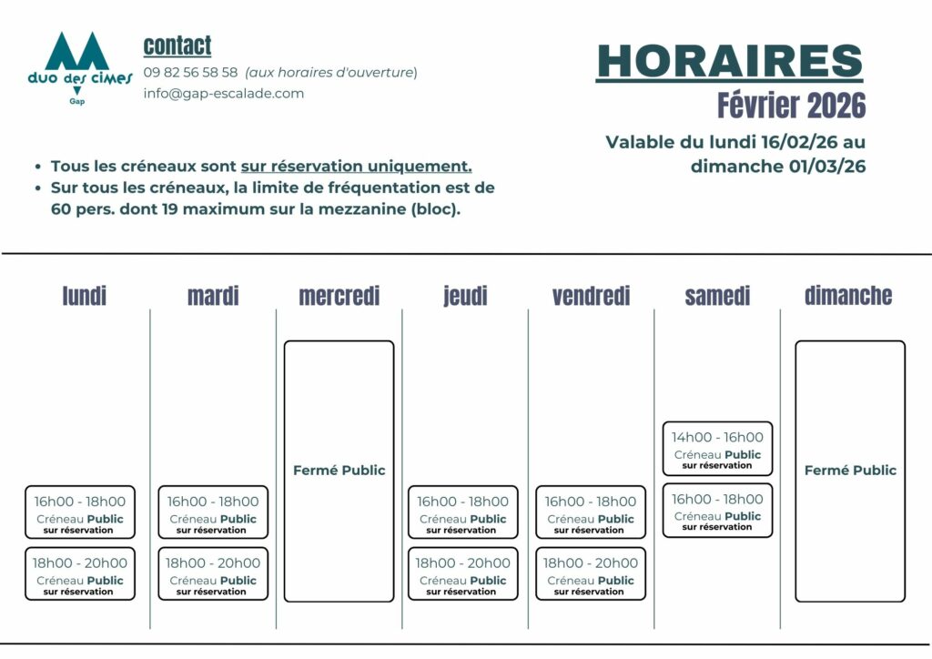 Pour ces vacances de février nous vous accueillerons en créneau « Tout public »du 16/02/26 au 28/02/26, de 16h00 à 18h00 puis de 18h00 à 20h00 et le samedi de 14h00 à 16h00 puis de 16h00 à 18h00.