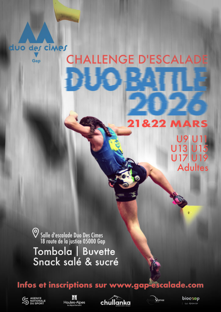 La Duo Battle –le challenge jeune et adultes d’escalade de Gap et troisième étape de la coupe du 05 pour cette saison – s’adresse à toutes et tous, jeunes et adultes, débutants et confirmés.